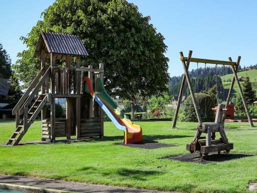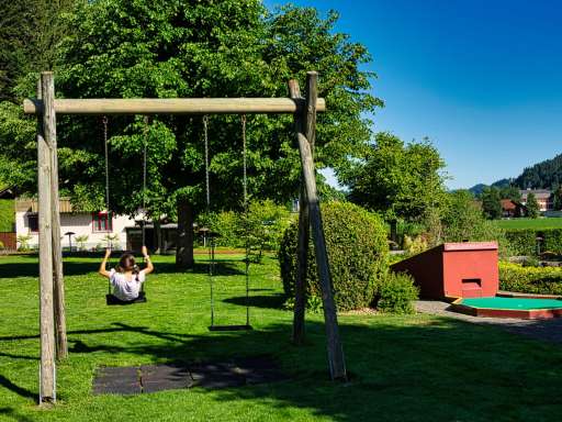 Der Spielplatz befindet sich mitten in der Minigolf Anlage im grossen Hotelgarten. Neben Spielturm mit Rutschbahn, Schaukeln und Wippen stehen den kleinen Gästen auch Traktore zur Verfügung um draussen zu spielen.